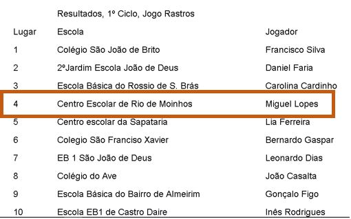 A nossa escola foi representada por três alunos que passaram uma primeira fase no Agrupamento, em que concorreram  cerca de 350 alunos. Todos tiveram uma excelente participação, tendo o Miguel Lopes chegado à final no jogo de Rastros e trazido para casa o quarto lugar.
